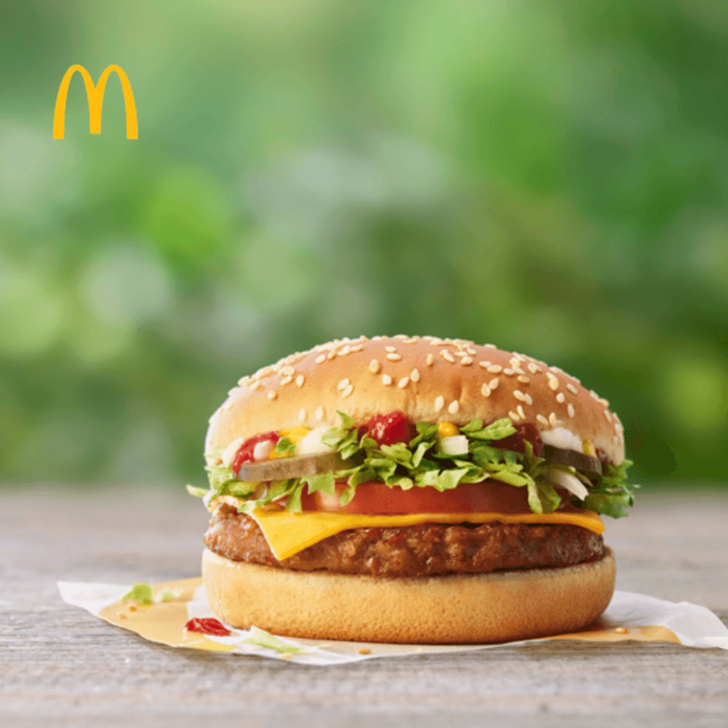 McDonald’s – A vegan burger made with a juicy plant-based patty co-developed with Beyond Meat® featuring vegan sandwich sauce, ketchup, mustard, onion, pickles, lettuce, tomato, and a vegan alternative to cheese in a sesame seed bun. (426 kcal)