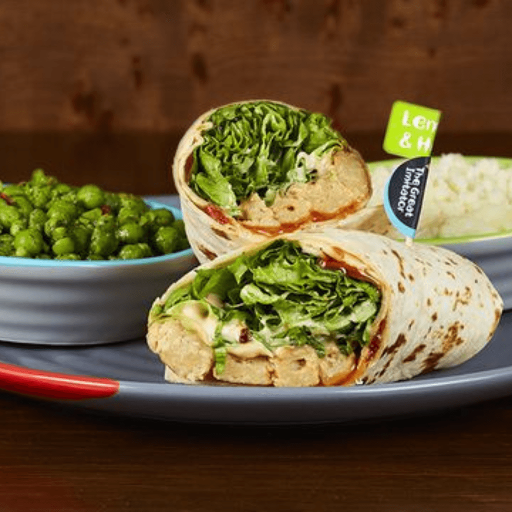 Nando’s – The Great Imitator Wrap, Peri-Plant strips made from pea protein and grilled in your favourite spice. Served in a wrap with Garlic perinaise, lettuce and chilli jam. (597 kcal)