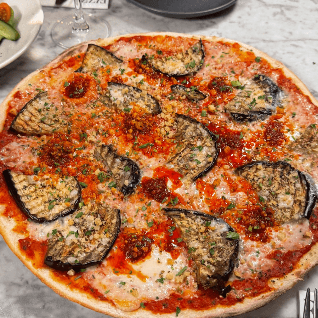 PizzaExpress – Vegan Harissa Melanzane, Char-grilled aubergines, tomato, garlic and vegan mozzarella alternative. Finished with crunchy garlic & rosemary breadcrumbs, smoky tomato & chilli harissa and parsley (888 kcal)